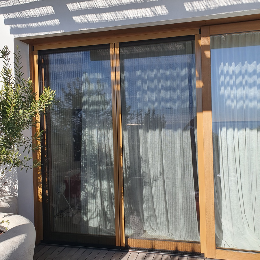 - Moustiquaire plissée de faible encombrement, avec système de guidage invisible et absence de rail au sol